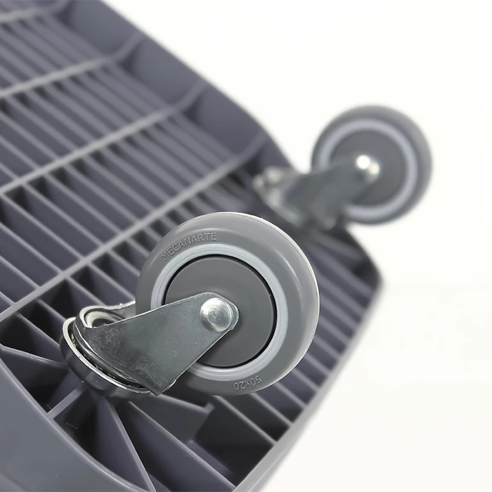 Ön tekerlekleri 50 mm, arka tekerlekleri ise 75 mm çapında, rulmanlı ve jant kapaklı sabit tekerleklerle donatılmıştır ; bu sayede manevra kabiliyetinden ödün vermeden geleneksel sepetlere göre daha fazla ağırlık taşıyabilir. Geniş tabanı sayesinde büyük eşyaları yerleştirmek için ideal olan bu sepet, süpermarketler, hipermarketler, oyuncakçılar, spor malzemeleri mağazaları, ev eşyaları mağazaları, bahçe merkezleri ve yapı marketleri için mükemmel bir çözümdür.